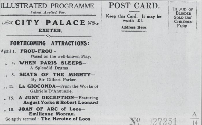 "The City Palace, Fore-street, Exeter, are making an exceptional bid for popular favour during the Christmas holidays. For the latter half of this week a special coloured pantomime, "Babes the Wood," now being shown at the London Opera House, is the principal item in the programme. Other dramatic, humorous, and interesting pictures are also announced. The Management intend to continue holiday programmes during the next two or three weeks, including the exclusive picture, "The Boy Scout Hero" and " Capt. Scott at the South Pole," both of which will meet with considerable favour among holiday seekers."
