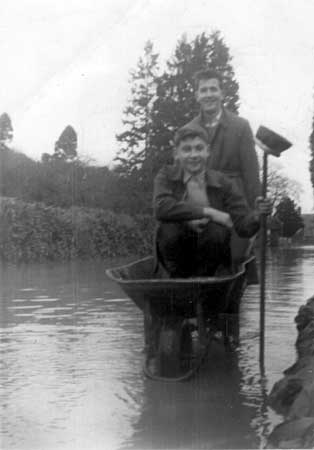 Mike Ewing, in the wheelbarrow lived in Exwick Villas during the floods