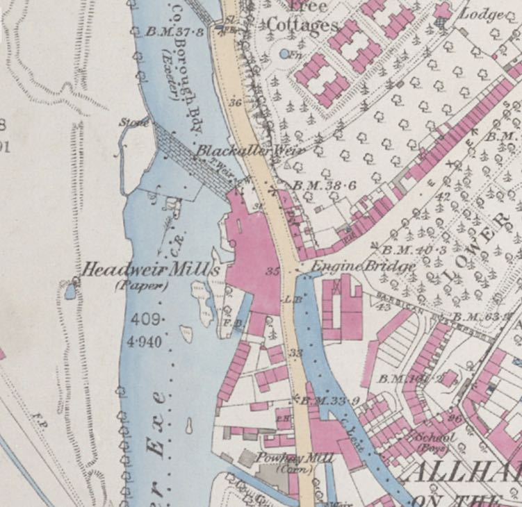 ‘Edward Pim of the City of Exeter, Paper Maker. On his Paper Mills and store rooms, workshops and offices adjoining and communicating, stone brick timber and slated situated in the parish of St Edmund in Exeter aforesaid, known by the name of the Head Weir Water Paper Mills, having no kiln or steam engine in, adjoining or communicating £600. On millwright’s work £400. On stock in trade £1000.’